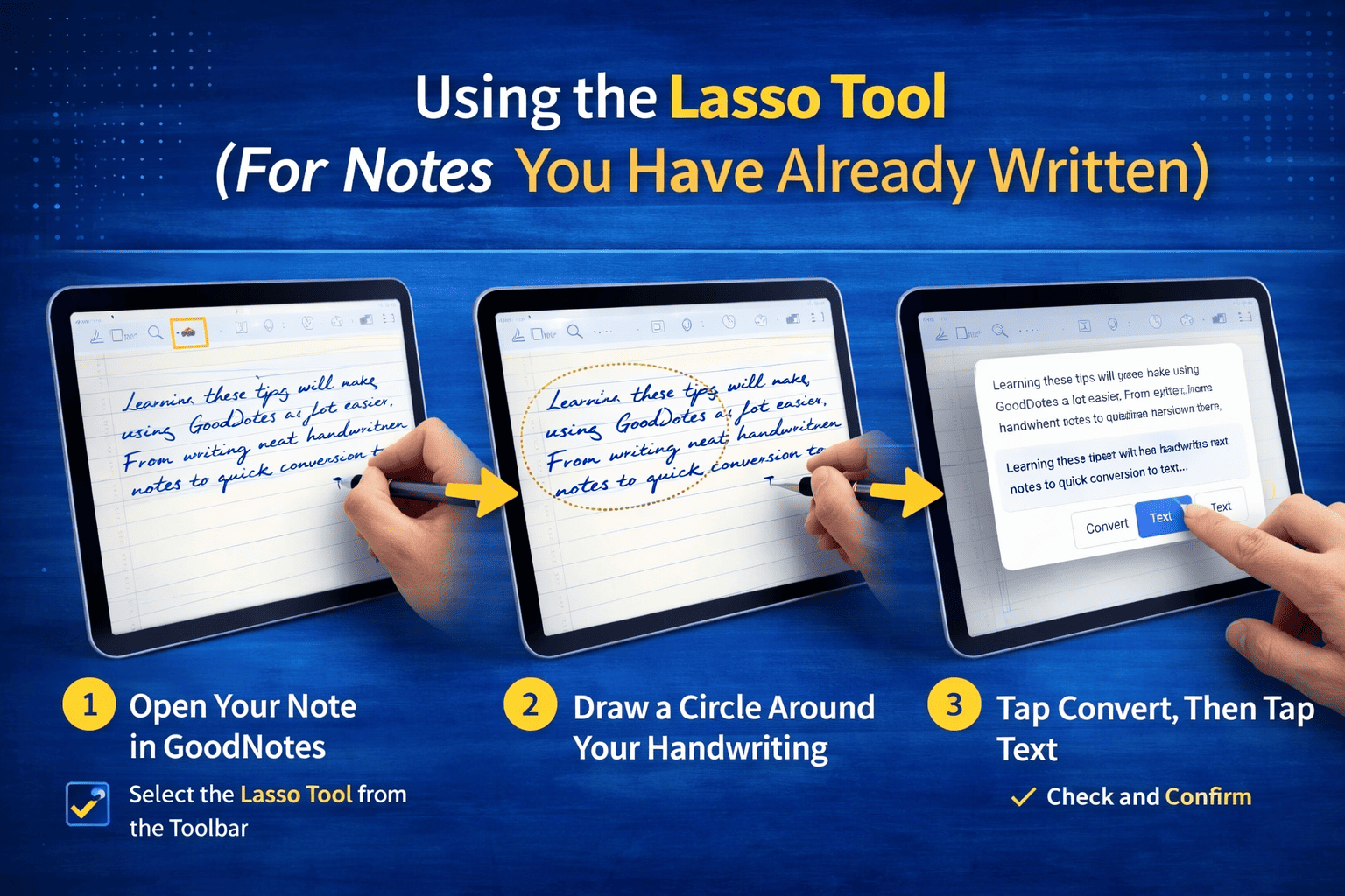 "Yes, GoodNotes can absolutely convert handwriting to text, and it does it well. The Lasso Tool is the easiest method for converting notes you have already written. Scribble is great if you want real-time conversion as you write."