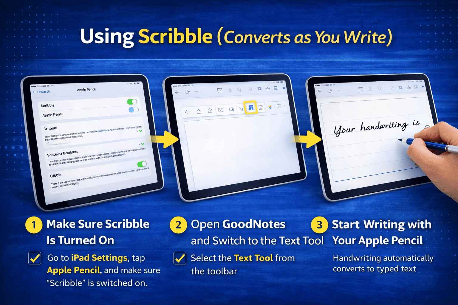 Scribble is a feature built into iPads that lets you write with your Apple Pencil inside any text box and it converts your handwriting into typed text automatically, right as you write. You do not have to do anything extra. Just write, and the text appears typed.
