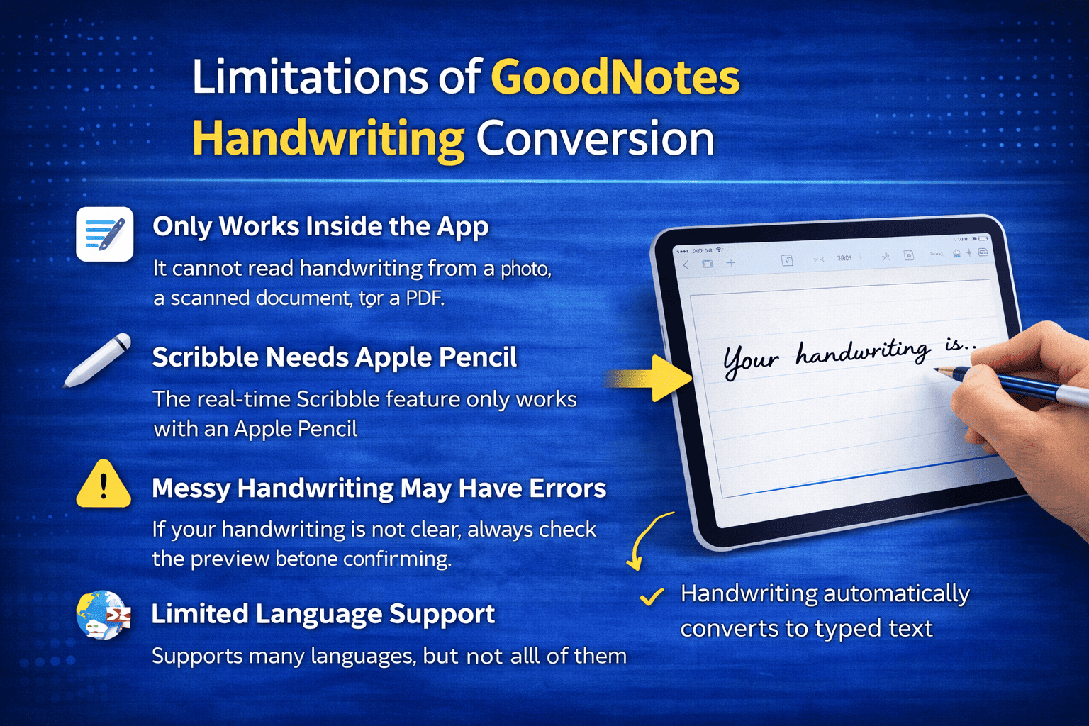 No. GoodNotes can only convert handwriting that was written directly inside the app. It cannot read handwriting from photos, scanned documents, or uploaded PDFs.