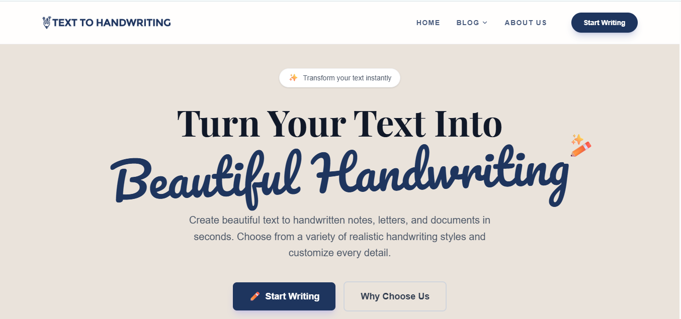 "Writing by hand takes time. Our text-to-handwriting converter creates professional, authentic handwritten work in minutes completely free with no sign-ups. Get 20+ styles, full customization, and high-quality downloads. Stop struggling with pen and paper. Start using our tool today to finish assignments faster. It's easy, free, and works perfectly."