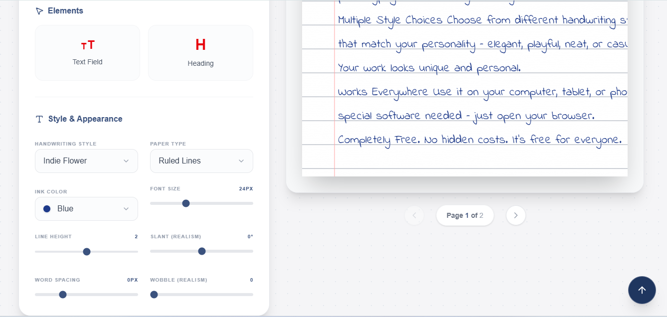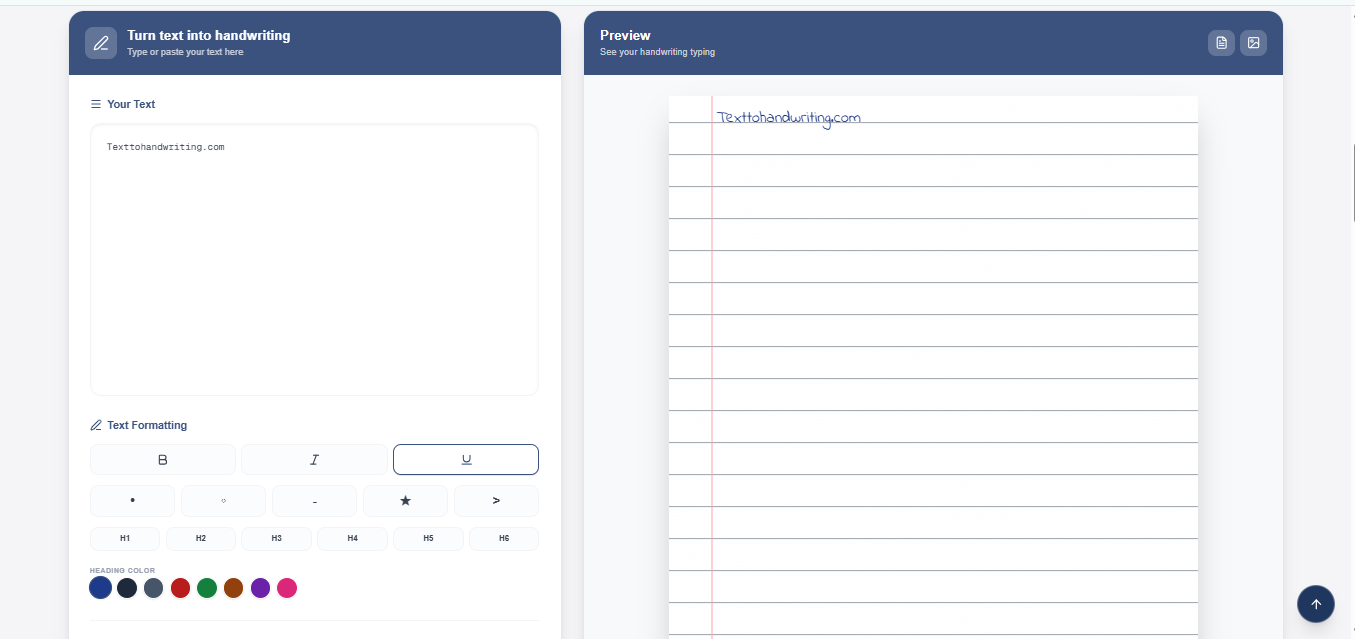 A text-to-handwriting converter is a simple online tool that converts typed text into handwritten-looking text. You type normally on your keyboard, and the tool makes it look like you wrote it by hand. It's free, easy to use, and requires no downloads or sign-ups.