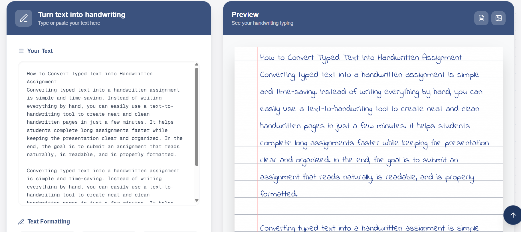 "Converting typed text into a handwritten assignment is simple and time-saving. Instead of writing everything by hand, you can easily use a text-to-handwriting tool to create neat and clean handwritten pages in just a few minutes. It helps students complete long assignments faster while keeping the presentation clear and organized. In the end, the goal is to submit an assignment that reads naturally, is readable, and is properly formatted."