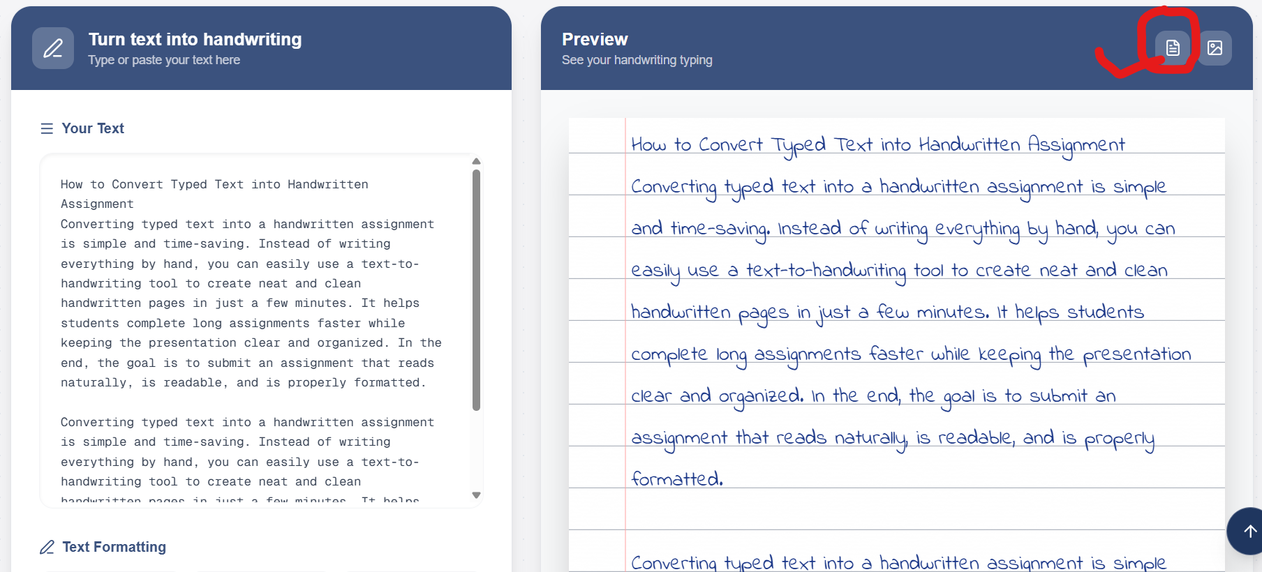 The easiest way to convert typed text into a handwritten assignment is by using an online generator like Text to Handwriting. Here is the step-by-step guide: